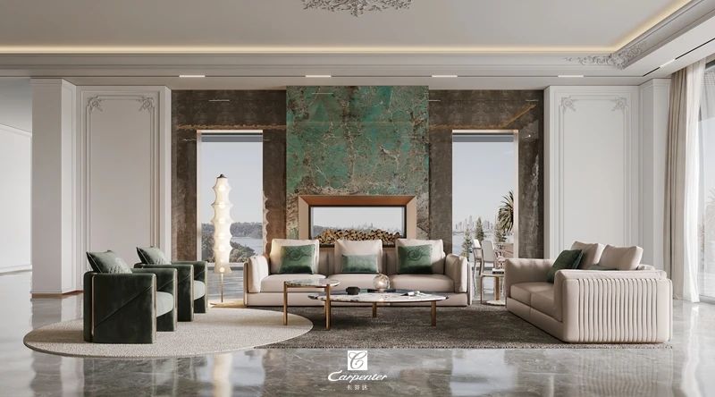 沙發(fā)背景墻采用翡翠色調(diào)大理石