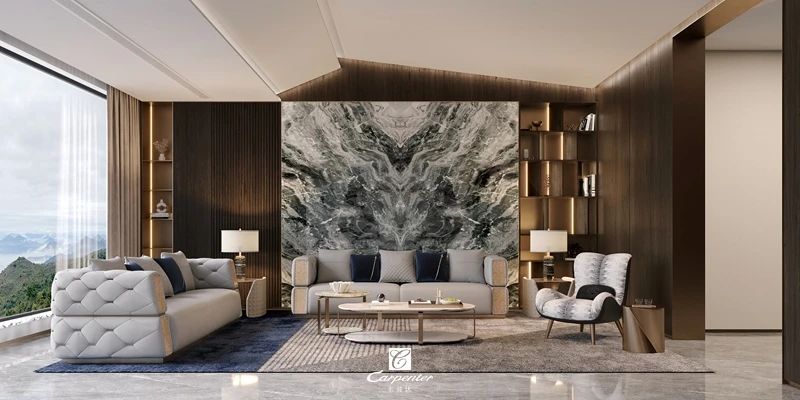 沙發(fā)背景墻采用翡翠色調(diào)大理石